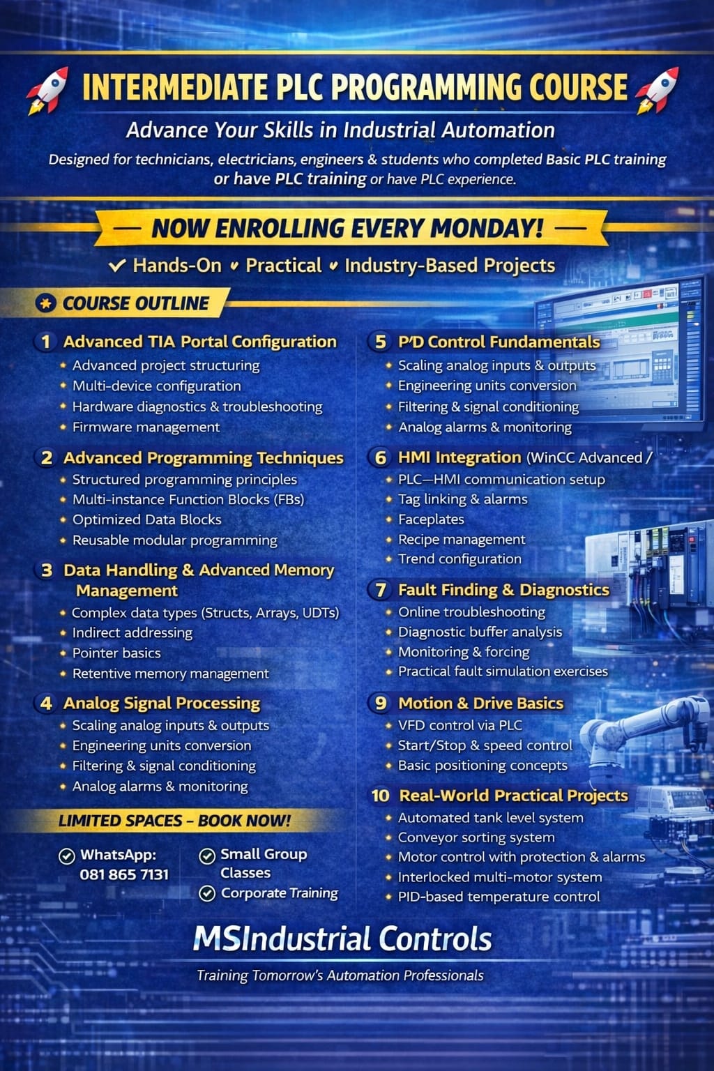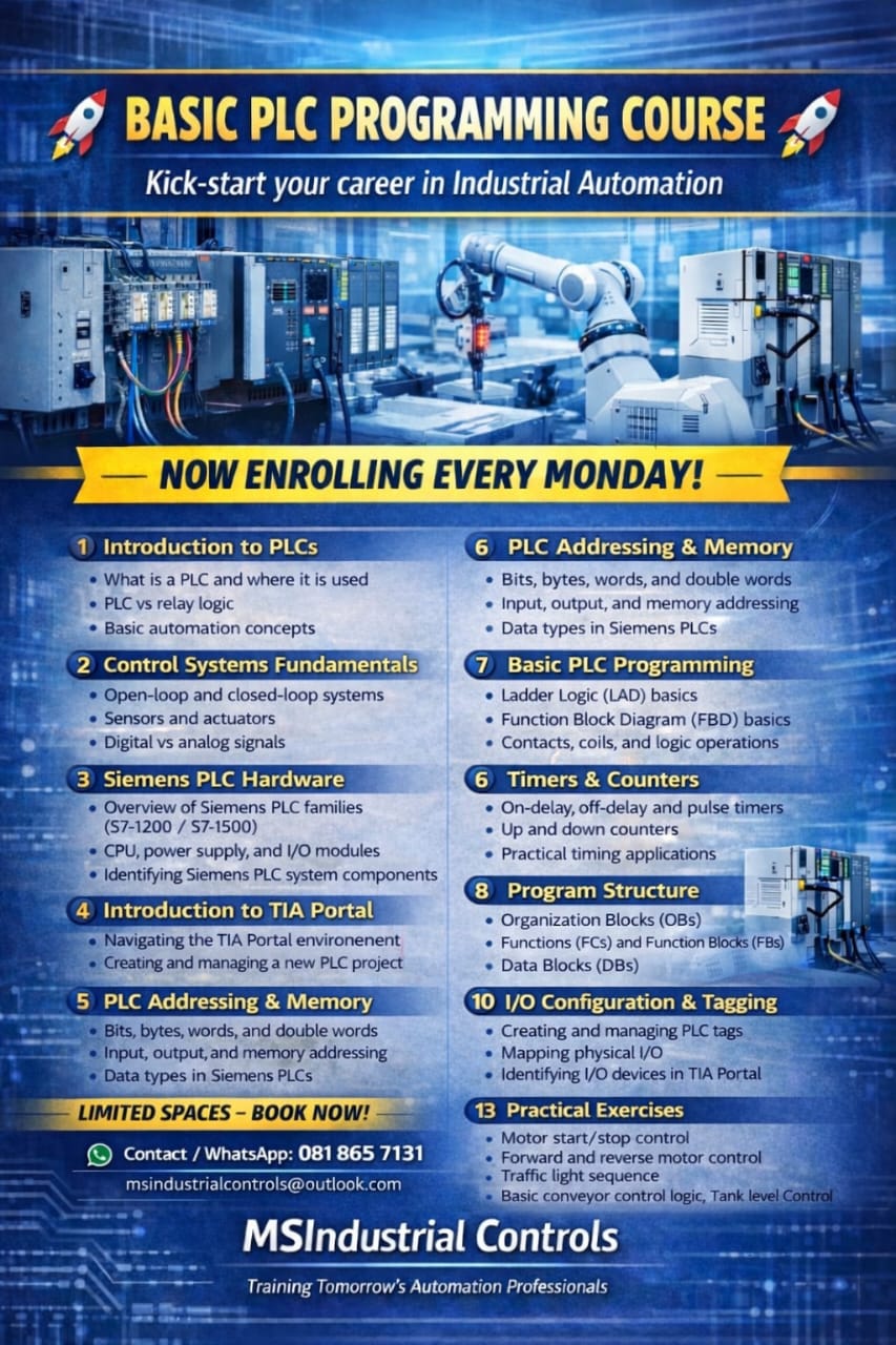 Our training prepares technicians, engineers, and students for real-world industrial automation environments, equipping them with the practical skills needed to work confidently with PLC-controlled systems.